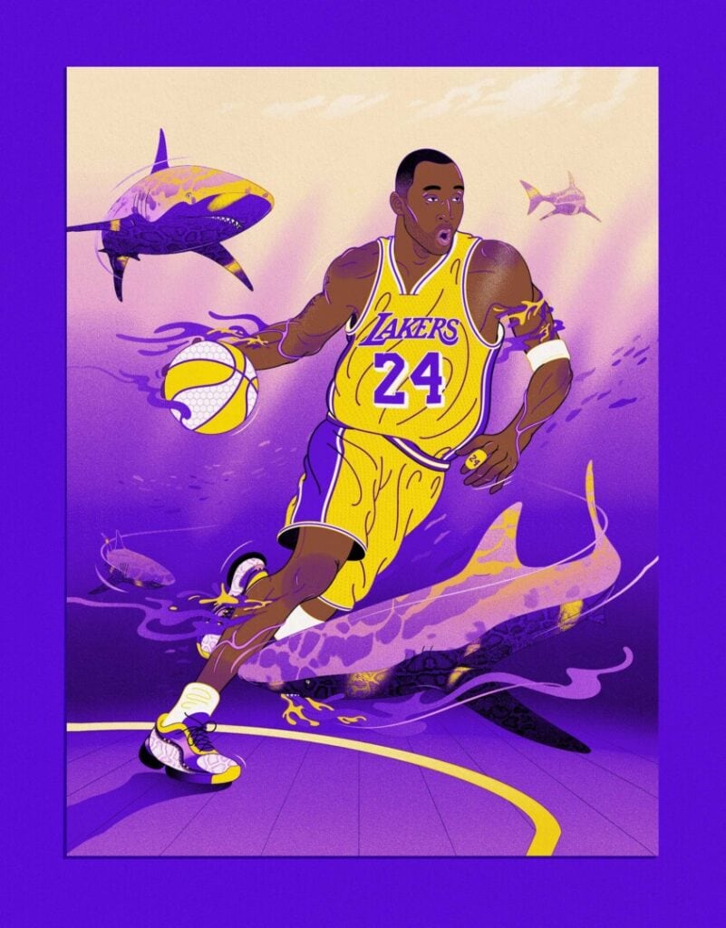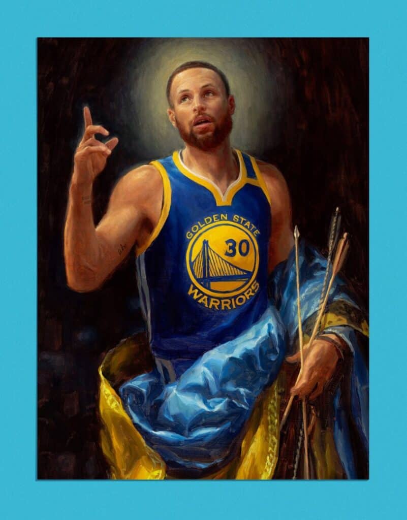 We like to find a balance between pairing a creative with a player they admire and pairing a creative with a player that fits their vibe. For Jerry West we always pictured someone like Charlie Griak or Marc Aspinall painting that one. We adore Ryan Pancoast’s Magic the Gathering work but knew he wasn’t super into hoops. Pairing him with Curry felt like a perfect match because he would be painting oil on canvas—a great aesthetic to match our vision of Curry as St. Sebastian. We always knew we wanted the Curry illustration to be inspired by a specific baroque painting of the Saint. When I close my eyes that’s all I could see: The patron saint of archers and athletes. To me, that’s Steph all the way.