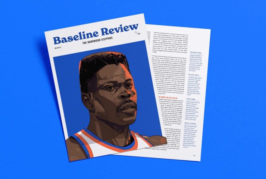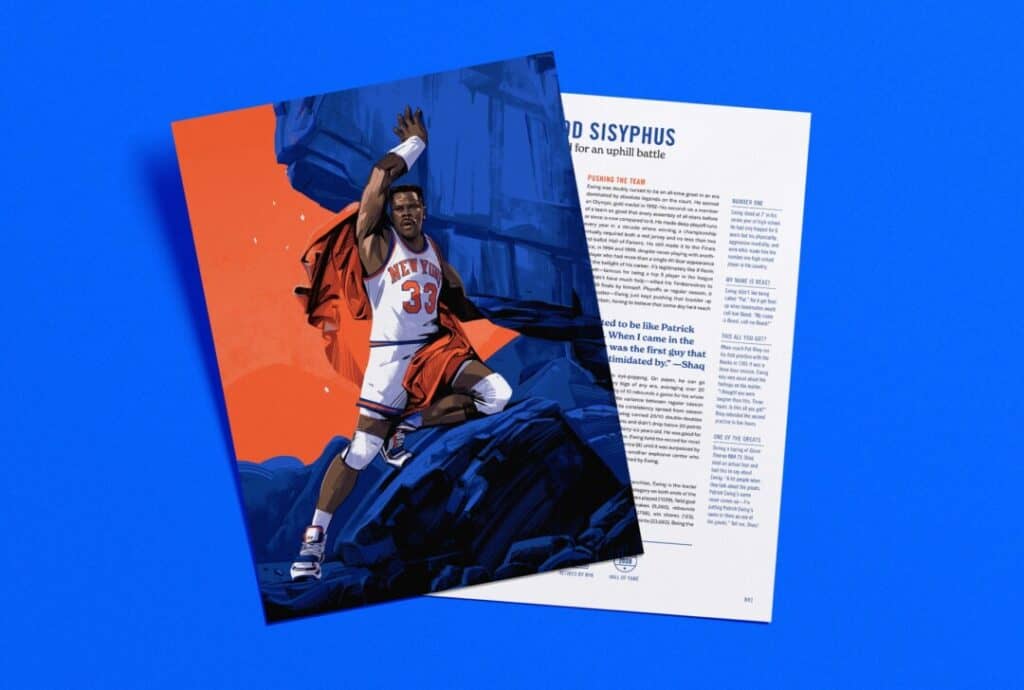 When it comes to pairing up creatives for a story I lean on creative vision and intuition. For most stories I have a vision of what the written component—and the illustrations—could feel like. Sometimes it’s just a simple prompt. Other times it’s super specific like: “The story—in some way—will draw comparisons between Ewing and Sisyphus. The main supporting illustration will be our take on a 200-year-old etching of Sisyphus. It’ll be Ewing’s head on Sisyphus’s body. He’ll be wearing a Knicks jersey and looking determined as ever.” It’s then up to Matt Wilding (the writer) and Oliver Barrett (the illustrator) of the Ewing story to interpret the prompt and put their own spin on it.